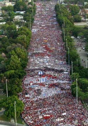 Hava Hundreds of thousands (just check out that photo!) of Cubans rallied in Revolution Square on Wednesday. Many people wore red and held posters of Hugo Chavez, paying tribute to the late Venezuelan leader, Cuba’s “best friend.”