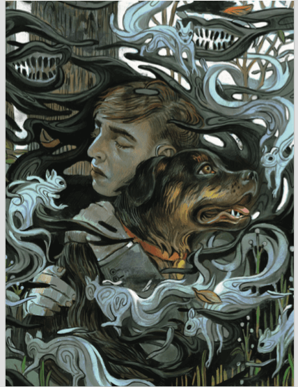 With a goopy sucking noise, the mouths join to form one enormous mouth, its black teeth grinning at me. I haul on Salvador’s leash. He stands but doesn’t move.