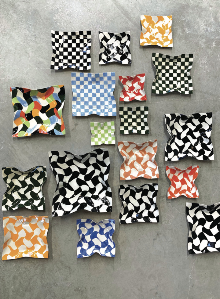 Now, Sangha has a process when designing ceramics, which includes referencing various photos, colours and patterns that she’s found, sketching the design and going into her studio to make it. Still, there’s room for experimentation. “Recently I saw someone wearing a sweater vest, and I was like, I love that pattern. I’m going to try and make it with ceramics.”
